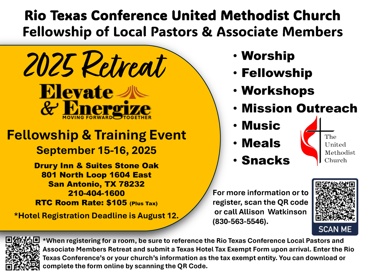 Calling all Local Pastors (retired, licensed, unassigned) and Associate Members to our September 15 & 16, 2025, Fellowship and Training Event! At this time of MOVING FORWARD, the ministry of our Local Pastors and Associate Members is critical to the movement of our congregations toward making disciples of Jesus Christ. This retreat is intended to be a great place to start this blessed work. Our time together will focus on worship, fellowship, learning, sharing, and, of course, prayer.
